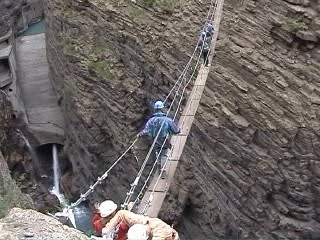 On enchaîne sur Le Grand Frisson en traversant une impressionnante passerelle de 35m située à 80m au dessus des eaux. On suit alors des vires ascendantes le long de parois verticales, on franchit une deuxième passerelle, on suit une vire jusqu'au pont du barrage. On sort en montant des échelons et des marches en rondin.