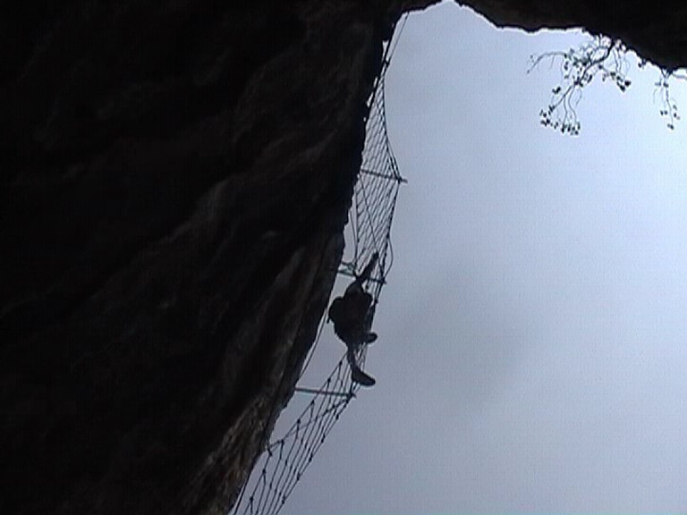 Après avoir franchi une passerelle de 30m, on gravit une tour détachée qui mène à une euxième passerelle de 30m. Un mur raide, puis une traversée, mènent à deux surplombs très athlétiques, passant juste au dessus du tunnel de la route. Un pont de singe, puis une traversée aérienne sous des surplombs amènent à deux grottes.