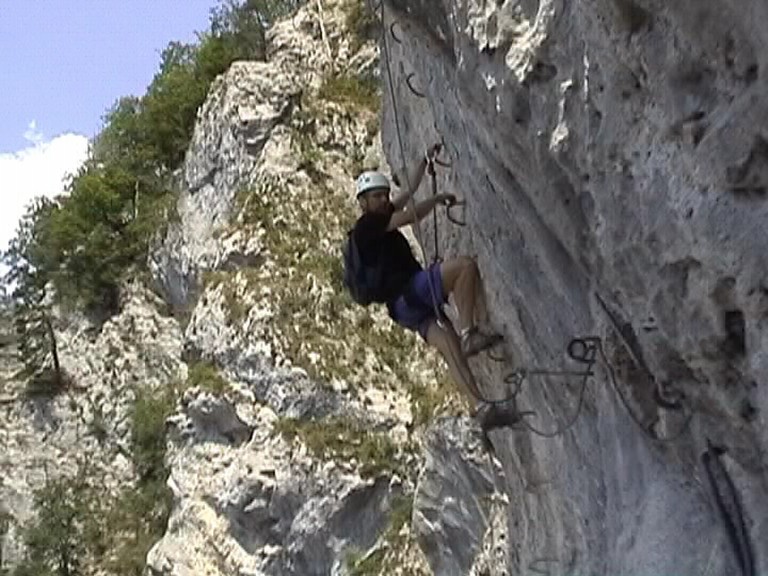 On traverse un pont de singe, et on remonte des dalles et des ressauts en diagonale. Une série de petits surplombs, suivie d'une rampe, permet d'atteindre le pied du surplomb de l'Ermite. Trois possibilités à ce moment: le surplomb, très court mais très athlétique; une échelle à l'envers (impressionnante car on monte face au vide), ou un échappatoire le long d'une vire.